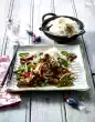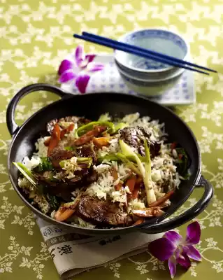 After 3 minutes add onions, ginger, garlic and remaining meat marinade and fry. Deglaze with broth, bring to the boil. Remove vegetables and stock. Heat 2 tablespoons of oil in a wok. Fry the rice for about 4 minutes, turning it.