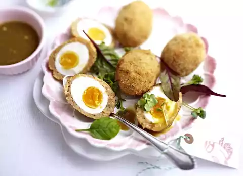 Add eggs to the hot oil and fry for 1-1 1/2 minutes while turning. Lift them out and let them drain. Mix mustard and honey. Cut cress from the bed. Cut the eggs lengthwise as desired. Arrange eggs with cress, salad leaves and some sauce on a plate. Add the rest of the sauce