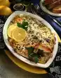 Season to taste with salt and pepper. Wash fish steaks and pat dry. Season with salt and pepper. Fry in the remaining hot fat for 2-3 minutes on each side. Turn lemon slices 1 time in the frying fat. Serve the salmon steaks, vegetables and lemon slices garnished with rosemary brush as desired