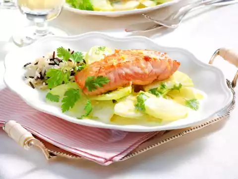 Heat the oil in a pan. Season salmon with salt and pepper and fry on both sides for 1 minute each. Remove the leaves from the chervil. Arrange the kohlrabi with the salmon on plates, sprinkle chervil on top. Wild rice mixture tastes good with it