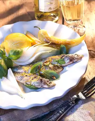 Drizzle both with olive oil and lemon juice. Sprinkle sardines with prepared mixture. Cook in the preheated oven (electric cooker: 225 ° C/ gas: level 4) for about 8 minutes. In the meantime, peel the onion and cut into fine slices. Wash the remaining lemons, also cut into slices. Wash the basil and pluck the leaves. Serve sardines, chilli peppers, onions and lemon wedges sprinkled with basil