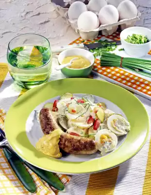 Season with paprika. Peel and finely chop the onion. Cut gherkins into fine slices. Cook egg in boiling water for 8-10 minutes. Cool, peel and cut into slices. Wash chives, dab dry and cut into fine rolls. Cut potatoes into fine slices and mix with the dressing. Add diced onion, chives, gherkin and egg slices. Mix all ingredients and