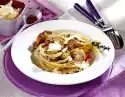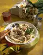 Season with salt. Pour egg milk over the noodles and let it set while stirring. Arrange on plates and sprinkle with parsley.