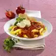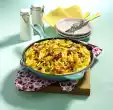 Melt the fat in a pan. Fry the noodles and onions for about 10 minutes, turning them over. After 4 minutes add breadcrumbs, corn and tomatoes. Season to taste with salt, pepper and nutmeg. In the meantime whisk eggs and milk.