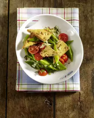 Mix salad dressing with onion and thyme. Drain the beans, rinse with cold water and drain. Mix with tomatoes and salad dressing. Season with pepper. Cut the tofu into slices. Cut each slice in half diagonally.