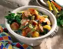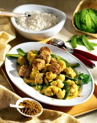 Peel and finely chop the onion. Heat the fat in a pot and sauté the onion in it. Add the rest of the flour and curry, sweat briefly and fill up with vegetable water and milk. Simmer gently for about 5 minutes. Heat oil in a pan and fry the tofu cubes in it for about 6 minutes on all sides. Add the cauliflower and sugar snap peas to the boiling sauce and heat up for about 1 minute. Arrange the cauliflower and sugar snap peas curry with the tofu cubes on a plate and garnish with coriander. Serve rice extra
