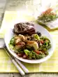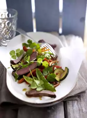 Wash the coriander, shake dry and pluck off the leaves. Cut the steaks into thin strips and arrange them on the fried vegetables. Sprinkle with coriander.