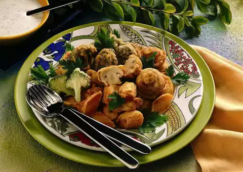 Put only so many pieces of vegetables in it that they do not touch each other. Arrange the fried vegetables on a plate and garnish with parsley. Add the yoghurt dip extra.