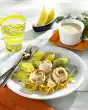 Heat 2 tablespoons of oil in a frying pan, place the fish with the skin side in the hot fat and immediately weight down with a pot (important so that the fish does not bend). Fry on medium heat for about 3 minutes on each side. Meanwhile, bring 375 ml water and salt to the boil in a saucepan, remove from the heat, add milk and stir in the puree flakes briefly. Stir in red onion cubes briefly. Arrange fish, bean salad and mashed potatoes on a plate. Garnish with bacon slices, onion slices, thyme and lemon slices