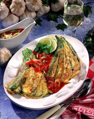 Heat some oil in 2 coated pans for 2 zucchini fans each. Dab vegetables dry with kitchen paper. Dip them into the batter, let them drip off a little and put them into the hot fat. Sprinkle with sesame seeds and fry for 5 minutes on each side over medium heat. Keep warm for a short time until everything is fried. Wash lime with hot water, dab dry and cut into slices. Arrange zucchini fans with some sauce on a plate. Garnish with remaining coriander and slices of lime