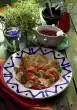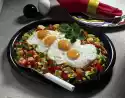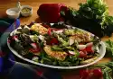 Clean the spring onions. Cut the onions diagonally into slices. Chop garlic finely. Boil up the spice sauce, 70 ml water, garlic and chunky tomato puree and season with salt. Fold in spring onions. Wash the coriander, dab dry and chop coarsely, except for a little bit for garnishing, and fold into the sauce. Keep the sauce warm. Heat some oil in 2 coated pans for 2 zucchini fans each. Dab vegetables dry with kitchen paper. Dip them into the batter, let them drip off a little and put them into the hot fat. Sprinkle with sesame seeds and fry for 5 minutes on each side over medium heat. Keep warm for a short time until everything is fried.