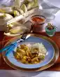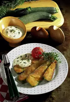 For the sauce, peel and finely dice the garlic and onion. Mash sheep's cheese with a fork and mix with yoghurt, onion and garlic. Season with salt and pepper. Remove the thyme leaves and add. Clean, wash and cut the zucchini into approx. 1/2 cm thick slices. Blanch briefly in boiling salted water and drain. Whisk the egg in a deep plate.