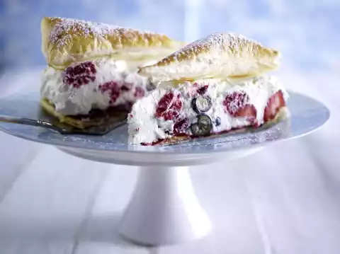 Spread the cake base with the jam. Spread the berry cream on top. Place the puff pastry cake pieces on the cream and dust with icing sugar.