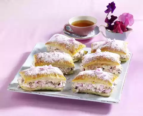 Place the puff pastry slices next to each other and let them thaw at room temperature for about 10 minutes. In the meantime whisk the egg yolk and 1 tablespoon of cream. Then cut in half and place on two baking trays lined with baking paper. Brush with egg yolk and bake one after the other in a preheated oven (electric cooker: 200 °C/ convection oven: 175 °C/ gas: level 3) for about 12 minutes. Remove from the oven and let cool on a cake rack.
