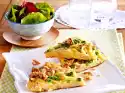 Whisk eggs and milk. Season with salt and pepper. Stir in chives. Heat oil in a large pan with lid (approx. 28 cm Ø). Fry mushrooms and spring onions in it. Add ham and fry for 1-2 minutes.