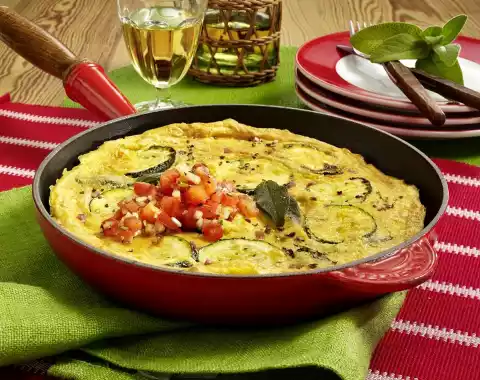 Mix tomatoes, onion, olive oil, vinegar and basil and season with salt, pepper and some dried chili flakes. Wash and clean the zucchini and cut into thin slices. Skip the bacon in a pan. Remove the bacon from the pan and fry the zucchini slices in the fat on both sides (add 1 teaspoon of oil if necessary). Remove the zucchini from the pan. Beat the eggs. Add cream and season with salt, pepper and some paprika. Heat 1 tablespoon of oil in a frying pan (approx. 20 cm Ø). First add 2 sage leaves to the pan, then half the eggs. Add half of the zucchini slices and bacon cubes and, stirring gently with a wooden spoon, let the egg fry halfway.