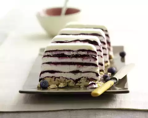 Spread 2 tablespoons of berry mixture on the frozen quark cream, freeze for at least 15 minutes. Repeat 4-5 times until the quark and berry mixture is used up.