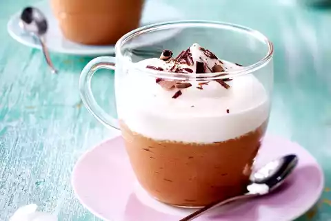Beat the egg whites with the whisks of the mixer until stiff, adding 30 g icing sugar. Carefully fold 2 portions of beaten egg whites into the melted chocolate. Divide the chocolate mixture into four glasses (each containing approx. 250 ml). Freeze for at least 3 hours, preferably overnight.