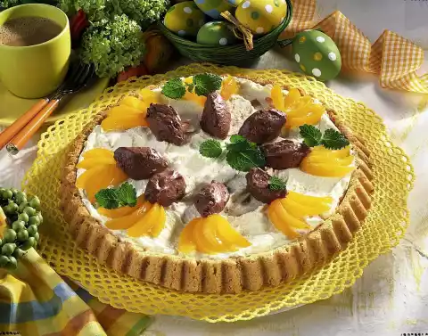 Roll out the dough into a circle (approx. 32 cm Ø) on a lightly floured work surface. Place the dough sheet in a well-greased fruit base mould (top 30 cm Ø, bottom 28 cm Ø) and press on. Prick several times with a fork. Bake in the preheated oven (electric cooker: 200 °C/ gas: level 3) for 20-25 minutes. Take the base out of the oven, let it cool down a little on a grid and turn out of the mould. Let the base cool down completely. In the meantime, drain the peaches well on a sieve. Cut 5 peach halves into wedges. Dice the remaining peaches. Place the sour cream, remaining cream and sauce powder in a mixing bowl and whisk until creamy. Carefully fold in the peach cubes. Spread the peach and vanilla cream on the cake base.