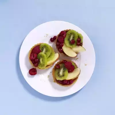 Peel the kiwi. Kiwi and nectarine and cut into thin slices or wedges. Clean and sort raspberries and currants. Cover the tartlets with the fruit.