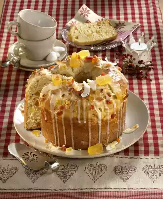 Cover the dough and let it rise in a warm place for about 45 minutes. In the meantime, grease a panettone mould (1.5 litres capacity) and dust with flour. Dice the dried fruit and mix with the coconut chips. Put 1 tablespoon of fruit-coconut mix aside for decoration. Mix the remaining fruit mix and rum. Knead the dough well again, incorporating the fruit-coconut mix. Fill the dough into the form and bake in the preheated oven, lower shelf (electric cooker: 175 °C/ convection oven: 150 °C/ gas: level 2) for approx. 1 hour. Cover if necessary after half the baking time. Remove the panettone from the oven, place on a cake rack and let it cool down. In the meantime, stir icing sugar and lime juice until smooth.