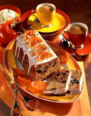 Cover the cake if it gets too dark. Remove the cake and let it rest in the pan for 10 minutes. Turn out onto a kitchen grid and let it cool down completely. Stir lemon juice and icing sugar until smooth and cover the cake with it. Halve the orange slices and decorate the fruit cake with them. Sprinkle with hazelnut leaves and let the icing dry completely