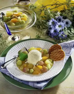 Drain the fruit. Cut pineapple and apricots into small pieces and mix with the gooseberries. Add vanillin sugar, lemon juice and gelatine, mix and chill for about 30 minutes. Arrange the fruit jelly with the ice cream on plates. Decorate with lemon balm and biscuits
