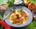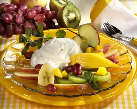 Wash apples, quarter them, remove seeds and cut them into slices. Peel banana, cut into thick slices. Arrange everything with the vanilla quark and decorate