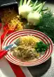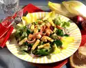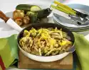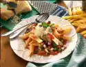 Peel and slice the kiwi. Wash, pluck and halve the grapes. Remove seeds if necessary. Peel mango, cut flesh into slices from the stone. Dice half of it. Mix everything with marinade