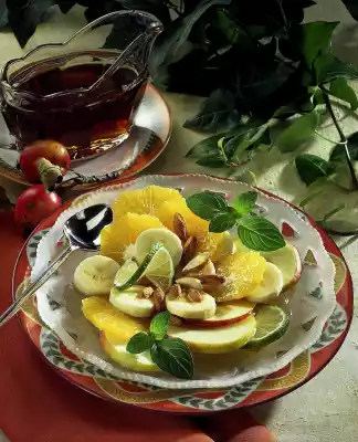 Peel oranges so that the white skin is completely removed. Cut oranges into slices. Wash the apples and cut out the cores. Cut apples into thin rings and sprinkle with some lime juice. Peel and slice the bananas and sprinkle them as well.