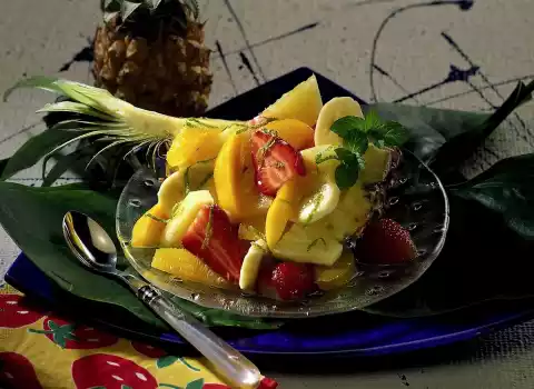 Mix fruit juices, lime zest and honey. Turn the fruit in it and arrange on a pineapple quarter each. Decorate with mint.