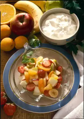Wash apple and pear thoroughly, quarter, core and cut into pieces. Peel the orange thickly, removing the white skin with it. Cut out the flesh between the skins, collecting the juice. Peel and slice the banana. Sprinkle with 1 tablespoon lemon juice. Cut the apricots into slices.