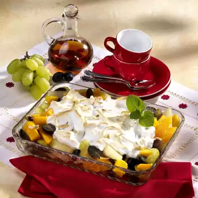 Mix the fruits and sprinkle with the marinade. Pour into an ovenproof casserole dish. Beat egg white and salt until stiff. Add icing sugar and continue beating. Fold the almonds, except for 1 tablespoon for sprinkling, into the egg whites.