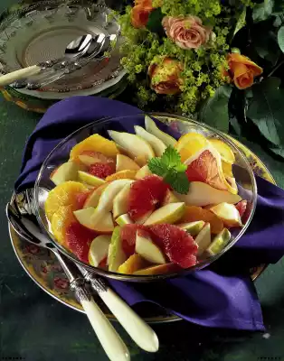 Cut pear into slices, apple into pieces. Mix pear, apple, grapefruit and orange. Pour the marinade over it and let it stand for about 30 minutes. Garnish fruit salad with lemon balm