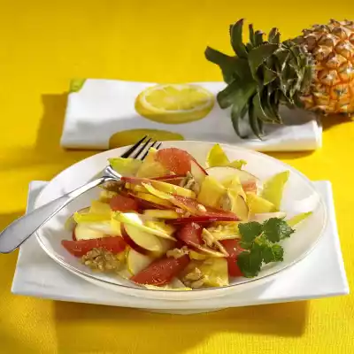 Warm the quince jelly slightly and stir until smooth. Mix with honey and lemon juice. Remove the chicory leaves from the stalk, wash and possibly chop a little smaller. Peel the pineapple, remove the hard stalk and cut the flesh into pieces.
