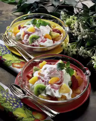 Mix quark, milk and vanilla sugar. Arrange the fruit. Spread curd sauce on top. Pour the marinade over the fruit and pull it through with a wooden skewer. Decorate with mint