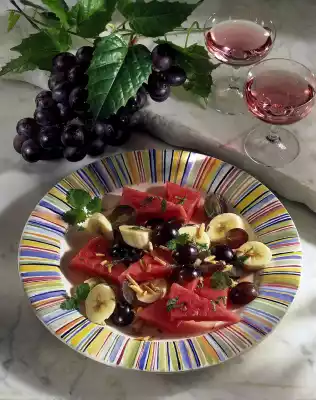 Marinate the melon pieces for about 1 hour. Wash the grapes, dab dry and cut in half. Then remove the seeds. Peel and slice the bananas. Mix melon with juice, grapes, bananas, sugar and vanilla sugar.
