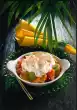 Roast almond slivers in a pan without fat until golden brown. Arrange the fruit salad on four plates, sprinkle with almond slivers. Decorate with balm leaves.