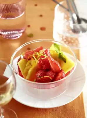 Wash and clean the strawberries. Depending on the size, halve or quarter them. Peel and quarter the pineapple and remove the stalk. Cut the flesh into thin slices. Mix the fruit with the juice, cover and chill for about 30 minutes. Spread fruit salad on bowls, decorate with lemon balm