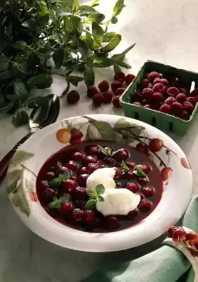 Raspberries selected. Cleaning, washing and stoning the cherries. Put grape juice and cherries in a large flat microwave oven. Sprinkle with cinnamon and sugar. Cover and cook for three minutes at 600 watts.