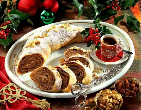 Shape into a ball and brush with remaining butter. Rinse a saucepan with boiling water and put it over the dough. Let the dough rest for about 1 hour. In the meantime, scald walnuts with boiling water and skin them. Grind with the gingerbread. Melt 50 g butter and let it cool down. Wash and drain the raisins, dice figs and dates finely and mix with raisins and melted butter. Cream egg yolk and icing sugar. Stir in the fig and date mixture, ground walnuts and gingerbread, cream, lemon and orange peel. Place a large tea towel on a work surface and sprinkle with flour. Place the dough on top and roll out as thin as possible to form a rectangle (approx. 40x50 cm). Melt the rest of the butter and spread the dough with 2 tablespoons of butter.