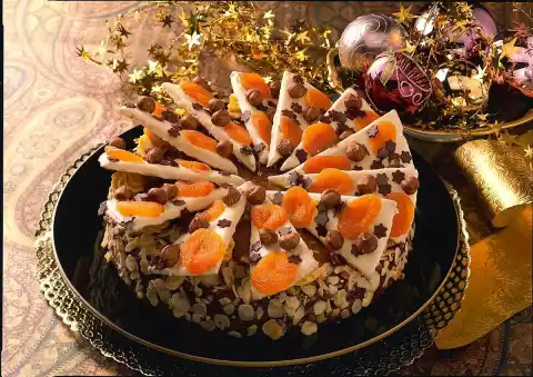 Pour the mixture into a piping bag with a star-shaped spout and squirt 12 dots onto the cake. Melt the chocolate coating in a hot water bath and cover the cake pieces with it. Decorate with nuts, apricot slices and chocolate stars.
