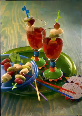 Fill the fruit tea with currant juice. Serve with the skewers. Decorate with lemon balm if desired. Makes 12-16 glasses