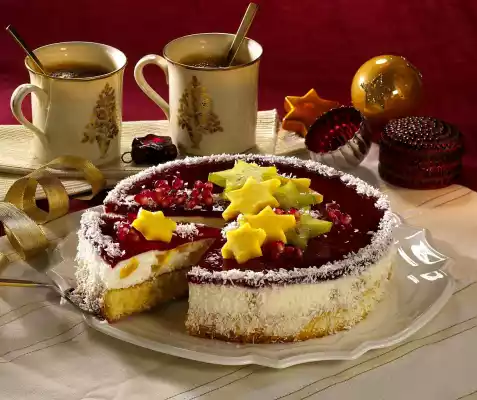 Squeeze gelatine and dissolve in it. Let the juice cool down and spread it on the yoghurt layer by the spoonful. Refrigerate for another 1 hour. Remove the ring from the cake. Sprinkle the edge of the cake with grated coconut. Peel mango and cut into slices from the stone. Cut out stars from the flesh. Wash the carambola, grate dry and cut into slices. Decorate the cake with mango stars, carambola and pomegranate seeds