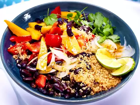 Bring 200 ml salted water to the boil, stir in the couscous. Remove from the heat and let it swell for about 5 minutes. Loosen the couscous with a fork and let it cool down.