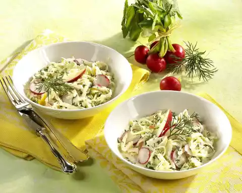 Wash the dill, dab dry and chop finely. Wash lemon balm, dab dry, remove leaves and cut into strips. Mix radish slices and grated kohlrabi and apple with the cream sauce. Fold in dill and lemon balm. Arrange salad on plates. Serve garnished with apple slices and dill