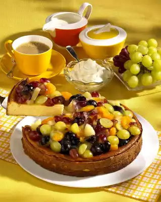 Mix quark, crème fraîche, 250 g sugar, lemon juice, eggs, pudding powder and semolina. Pour the quark mixture into a greased and floured springform pan (26 cm Ø) and smooth it down. Bake in a preheated oven (electric cooker: 175 °C/ convection oven: not suitable/ gas: level 2) for 50-60 minutes. If necessary, cover after 40 minutes of baking time. Remove the cake from the oven, remove from the edge of the springform pan and let it cool on a cake rack for 2 hours. After about 1 1/2 hours, drain the mandarin oranges and pineapple pieces, collecting the juice. Clean, wash, halve and seed the grapes.