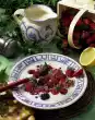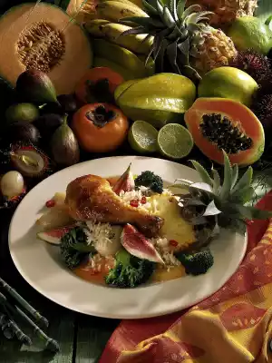 Clean and wash the broccoli and cut it into small florets. Cook in boiling salted water for about 8 minutes. Cook rice in boiling salted water for about 20 minutes. Meanwhile wash the legs and pat them dry. Melt the sugar in a pan until golden brown. Turn the legs and season with salt and pepper. Deglaze with 400 ml water and vinegar, cook for about 20 minutes. In the meantime, peel the pineapple, cut it into quarters lengthwise and cut out the stalk. Cut the flesh into small pieces. Peel, halve and stone the lychees. Cut figs into slices; cut chillies lengthwise, remove seeds and cut into small rings. Add pineapple, lychees and chillies to the legs 3 minutes before the end of cooking time. Serve everything garnished with rice and pineapple