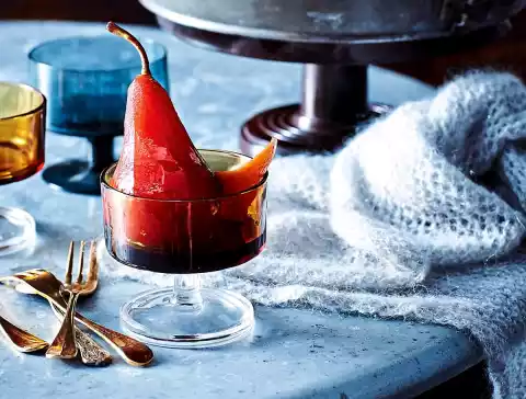 Peel the pears and place them in the wine stock. Bring to the boil covered and simmer for 15-20 minutes until the pears are soft. Lift out the pears. Boil down wine stock open for 10-15 minutes until slightly syrupy. Serve hot or cold with the pears.