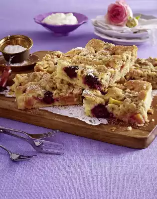 Wash, clean and halve peaches, remove stones and cut peach halves into pieces. Sort blackberries. Spread the peach pieces and blackberries on the cake, sprinkle with crumbles and bake in the preheated oven (electric range: 200 °C/ convection oven: 175 °C/ gas: level 3) for approx. 45 minutes until golden brown